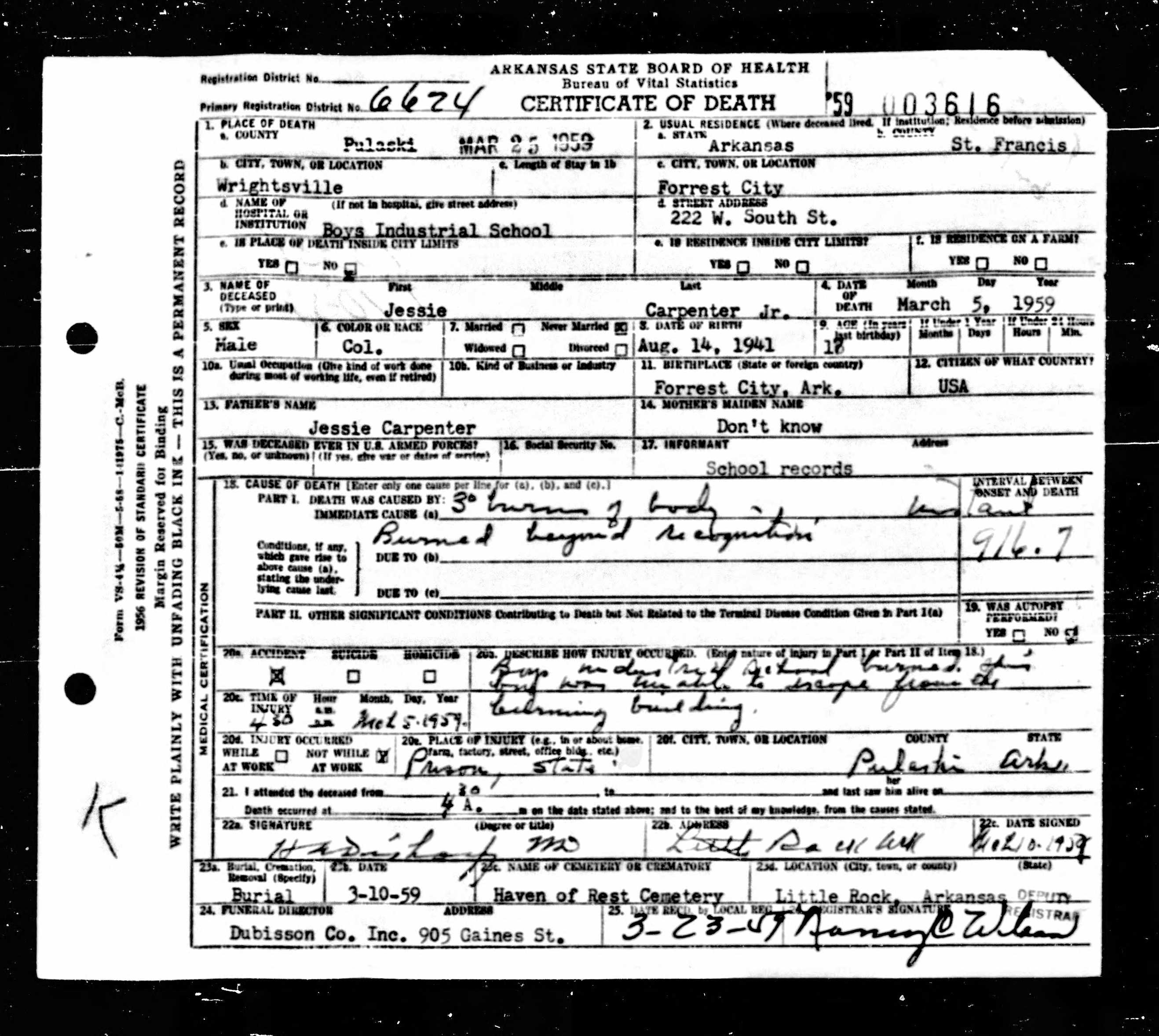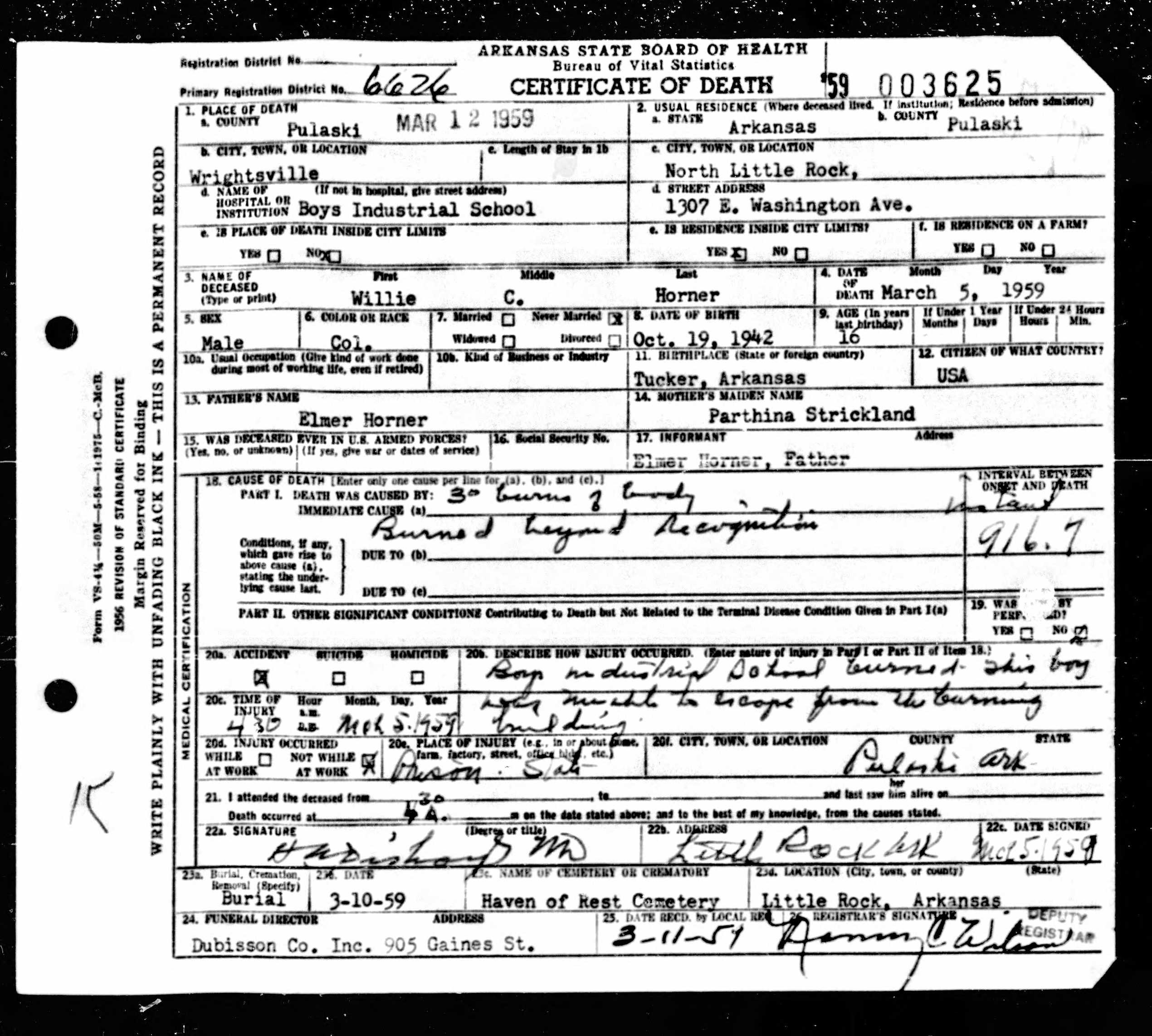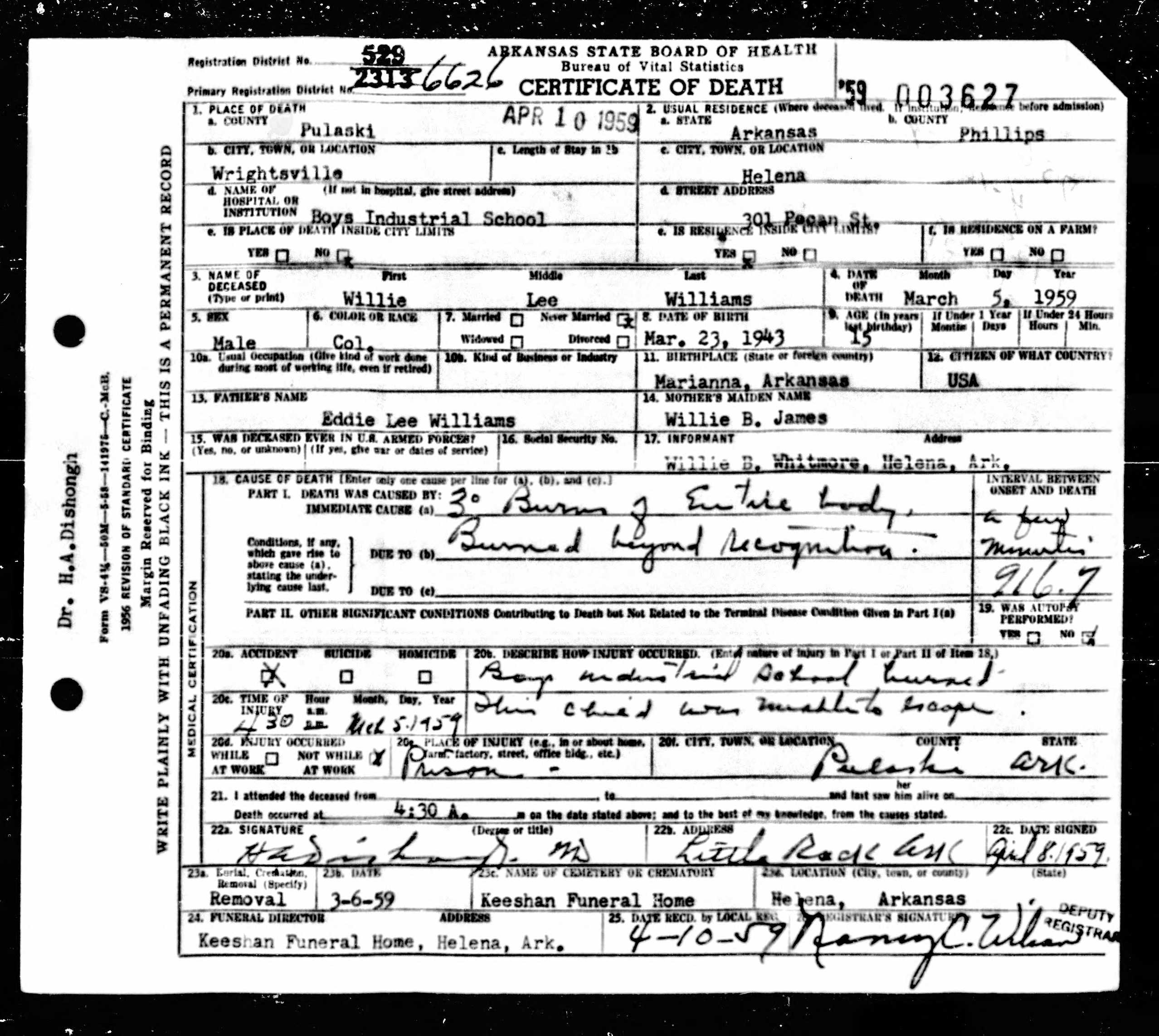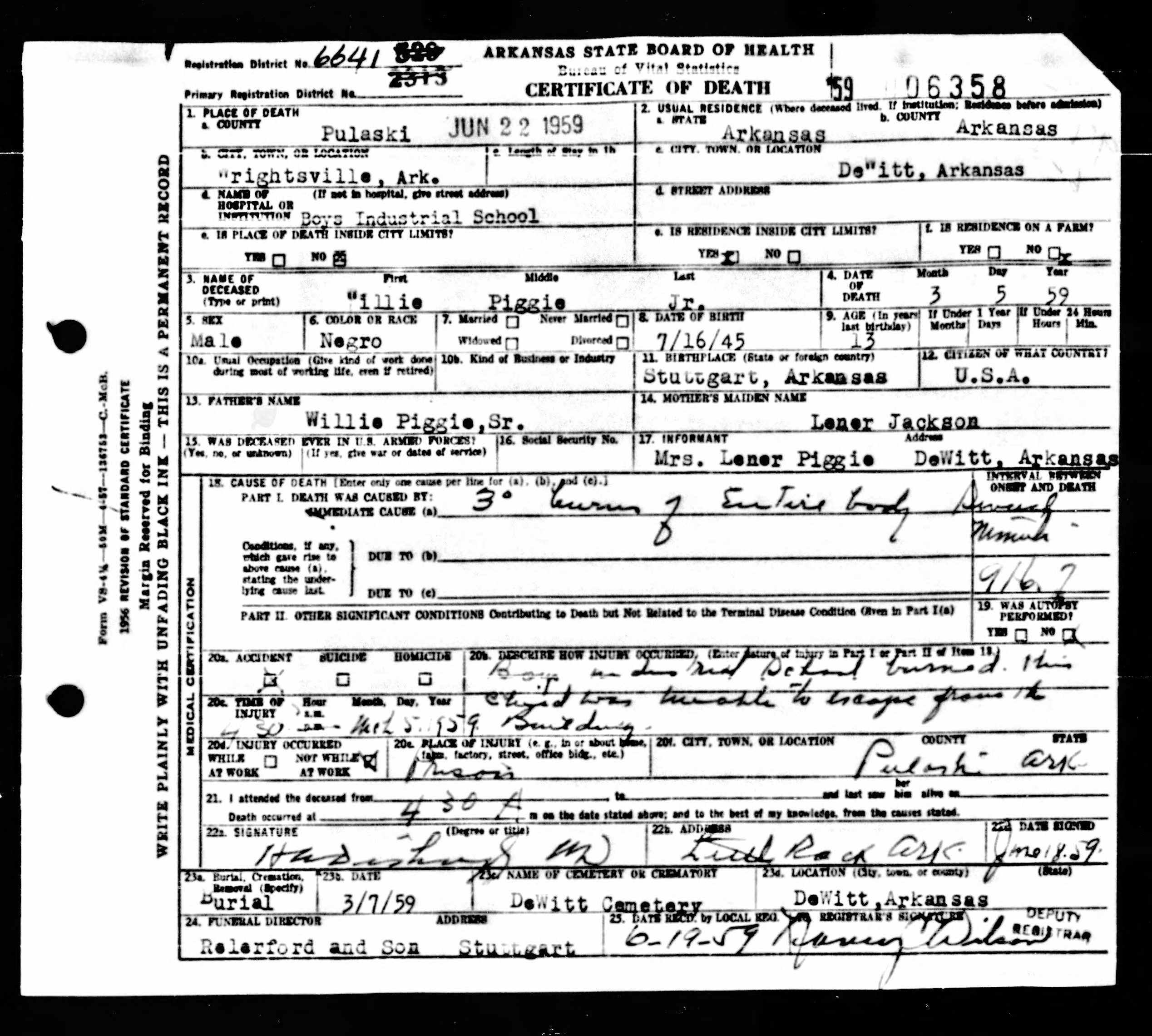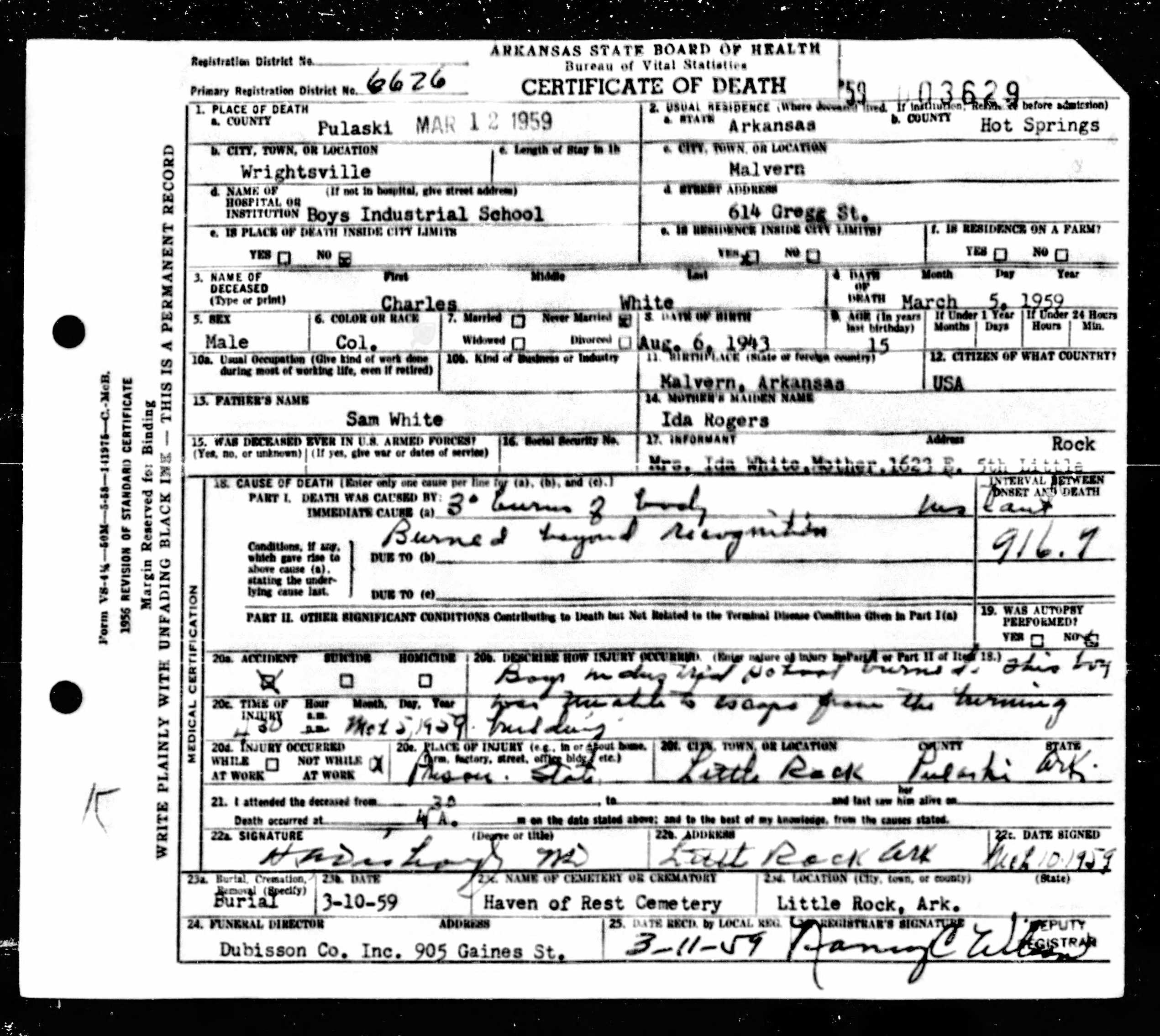 21 Dead Kids and 21 Death CertficiatesRemembering the names of the deadThe Coroner's Report PodcastNov 19, 2025ShareFrank Barnes from Lake Village, ArkansasR. D. Brown from Emerson, ArkansasJessie Carpenter from Forrest City, ArkansasJoe Crittenden from Blytheville, ArkansasLindsey Cross from North Little Rock, ArkansasJohn Daniel from El Dorado, ArkansasHenry Daniels from Little Rock, ArkansasJohn George from North Little Rock, ArkansasAmos Gyce from Woodson, ArkansasRoy Allen Hegwood from El Dorado, ArkansasWillie Horner from North Little Rock, ArkansasO. T. Meadows from El Dorado, ArkansasWillie Piggee Jr. from Dewitt, ArkansasRoy Chester Powell from Forrest City, ArkansasCecil Preston from Antoine, ArkansasCharles Lewis Thomas from Little Rock, ArkansasCarl Edward Thornton from North Little Rock, ArkansasJohnnie Tillison, Jr. from La Grange, ArkansasEdward Tolston from Wilmot, ArkansasCharles White from Malvern, ArkansasWillie Lee Williams from Helena, ArkansasPrevious