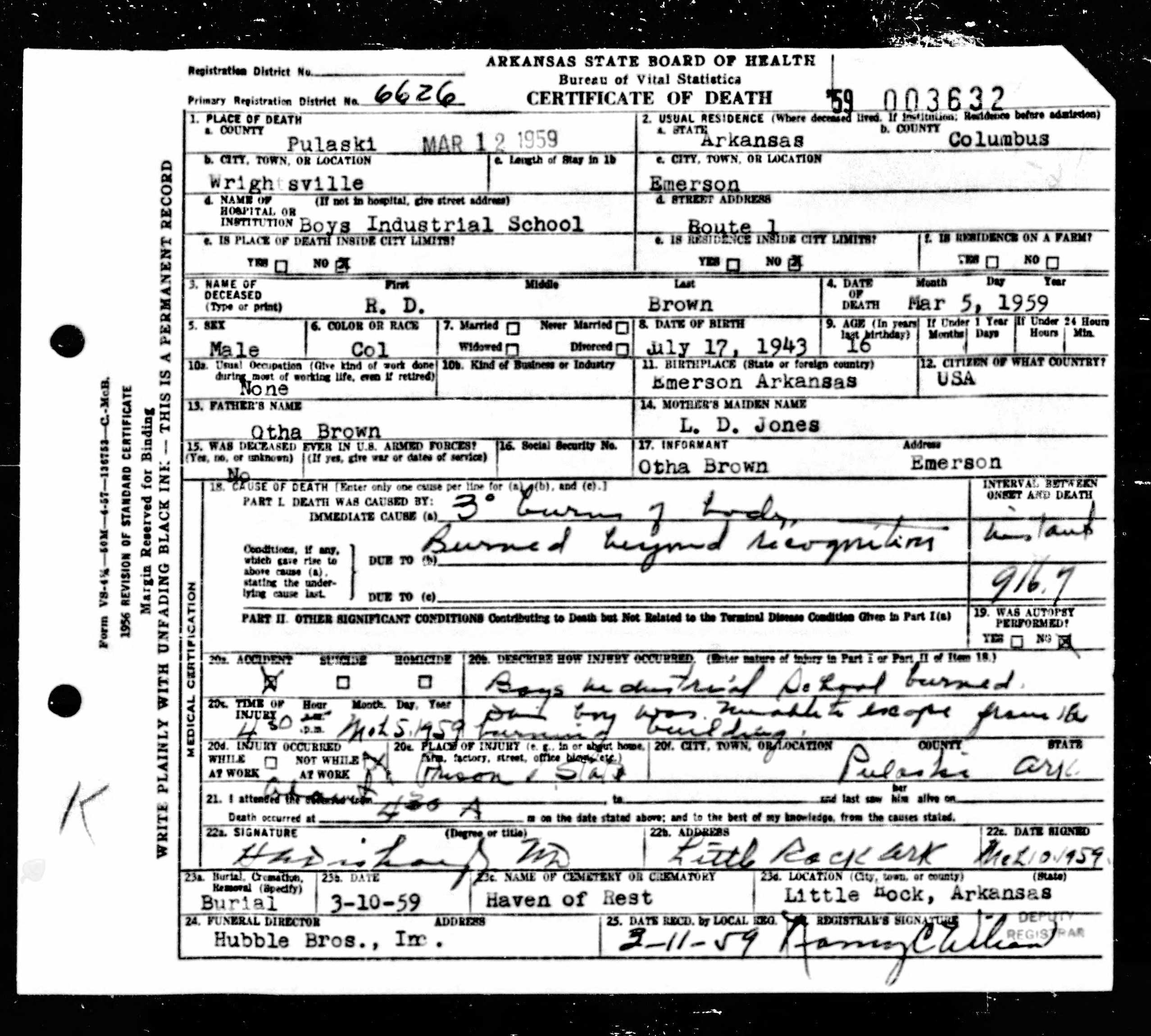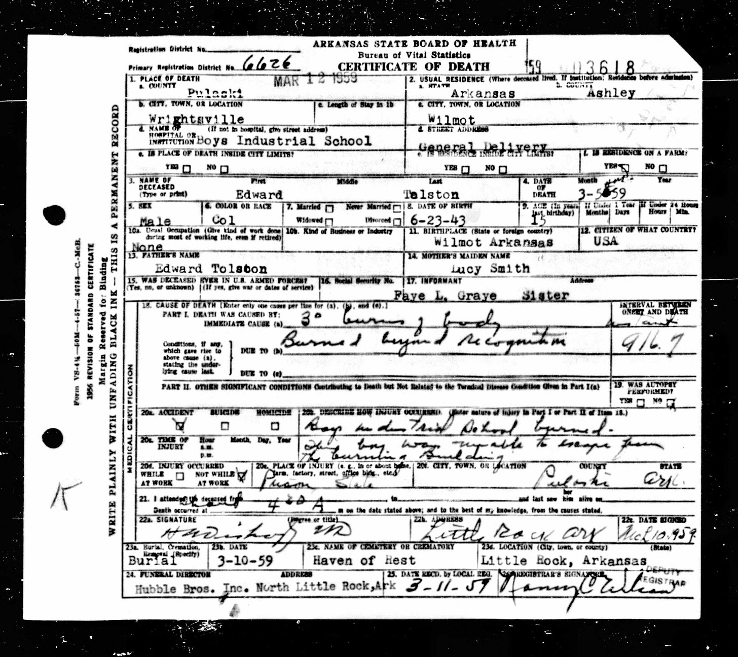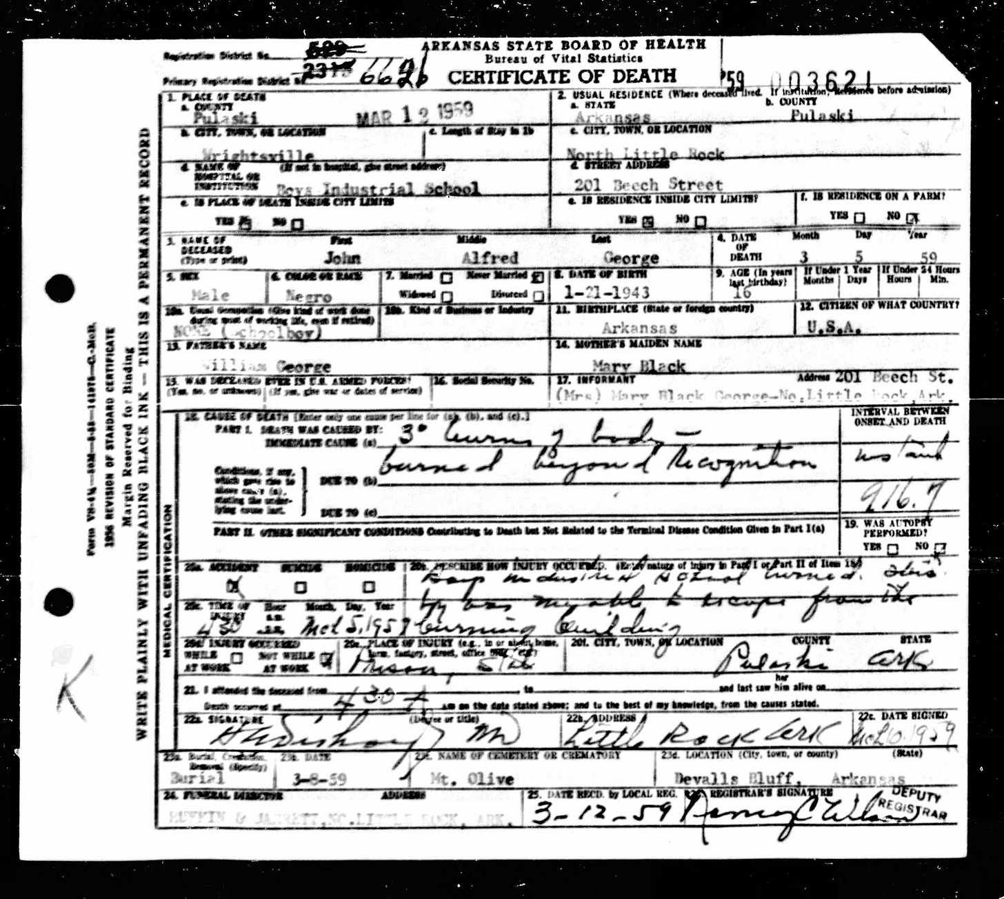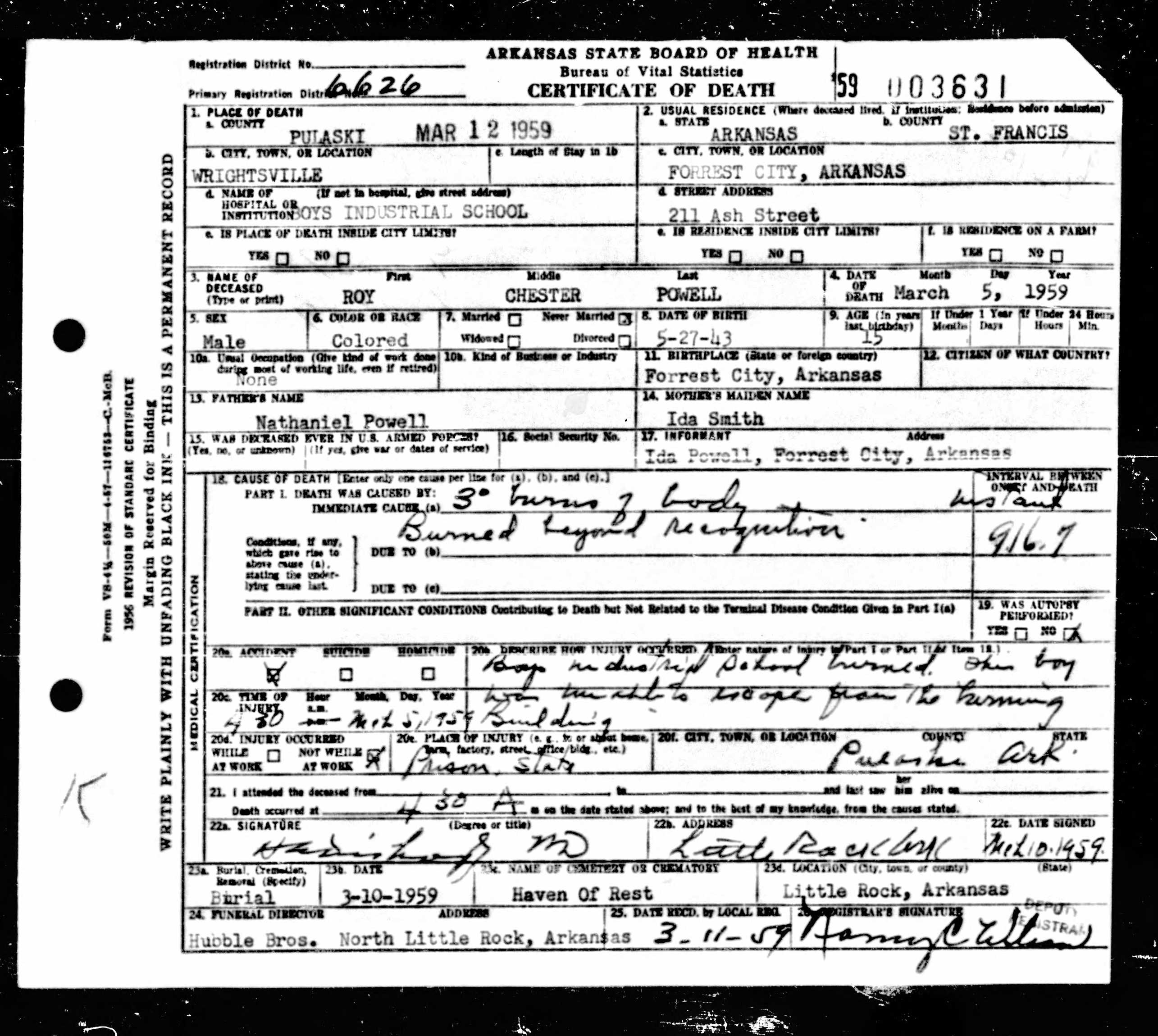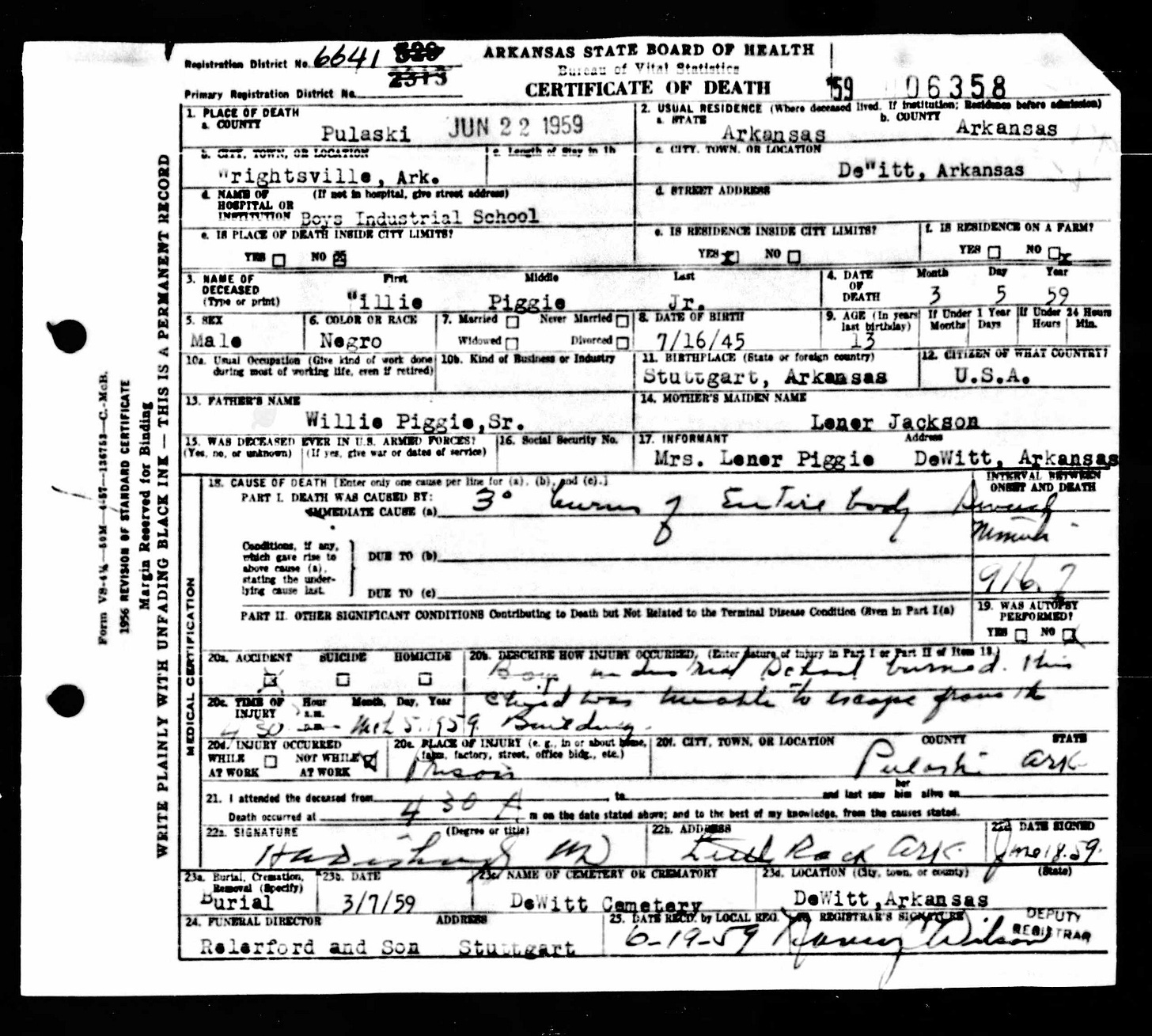 21 Dead Kids and 21 Death CertficiatesRemembering the names of the deadThe Coroner's Report PodcastNov 19, 2025ShareFrank Barnes from Lake Village, ArkansasR. D. Brown from Emerson, ArkansasJessie Carpenter from Forrest City, ArkansasJoe Crittenden from Blytheville, ArkansasLindsey Cross from North Little Rock, ArkansasJohn Daniel from El Dorado, ArkansasHenry Daniels from Little Rock, ArkansasJohn George from North Little Rock, ArkansasAmos Gyce from Woodson, ArkansasRoy Allen Hegwood from El Dorado, ArkansasWillie Horner from North Little Rock, ArkansasO. T. Meadows from El Dorado, ArkansasWillie Piggee Jr. from Dewitt, ArkansasRoy Chester Powell from Forrest City, ArkansasCecil Preston from Antoine, ArkansasCharles Lewis Thomas from Little Rock, ArkansasCarl Edward Thornton from North Little Rock, ArkansasJohnnie Tillison, Jr. from La Grange, ArkansasEdward Tolston from Wilmot, ArkansasCharles White from Malvern, ArkansasWillie Lee Williams from Helena, ArkansasPrevious