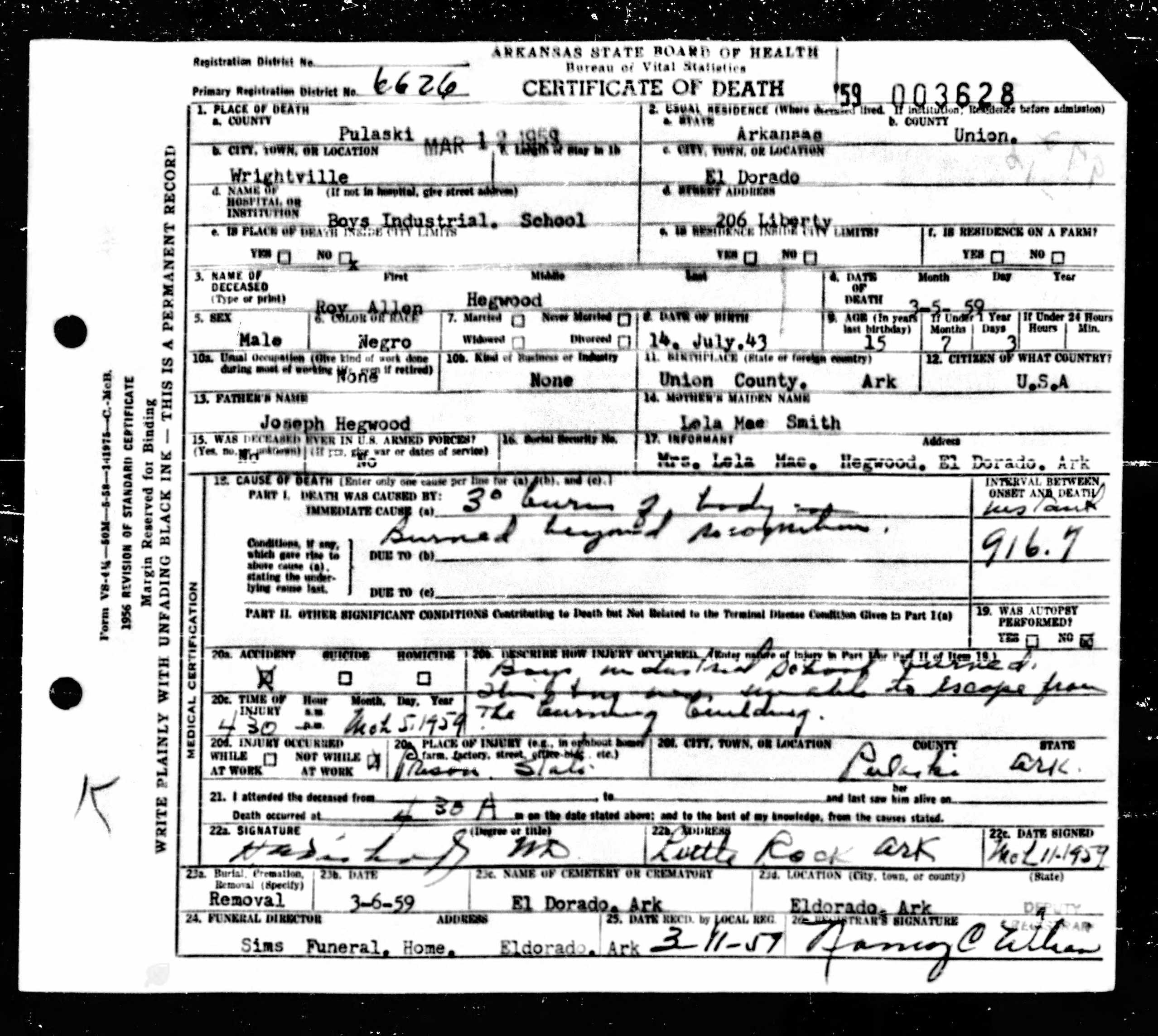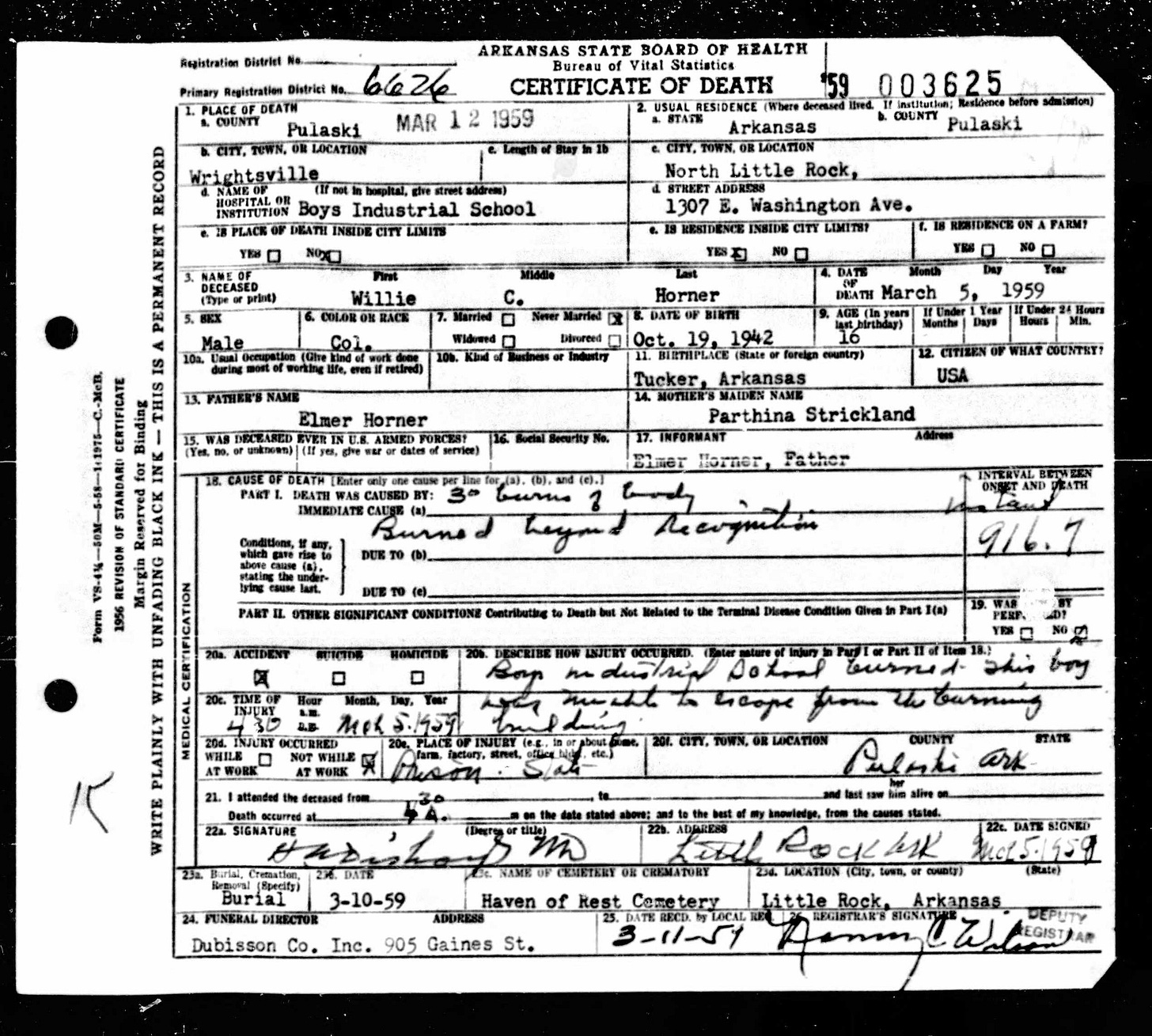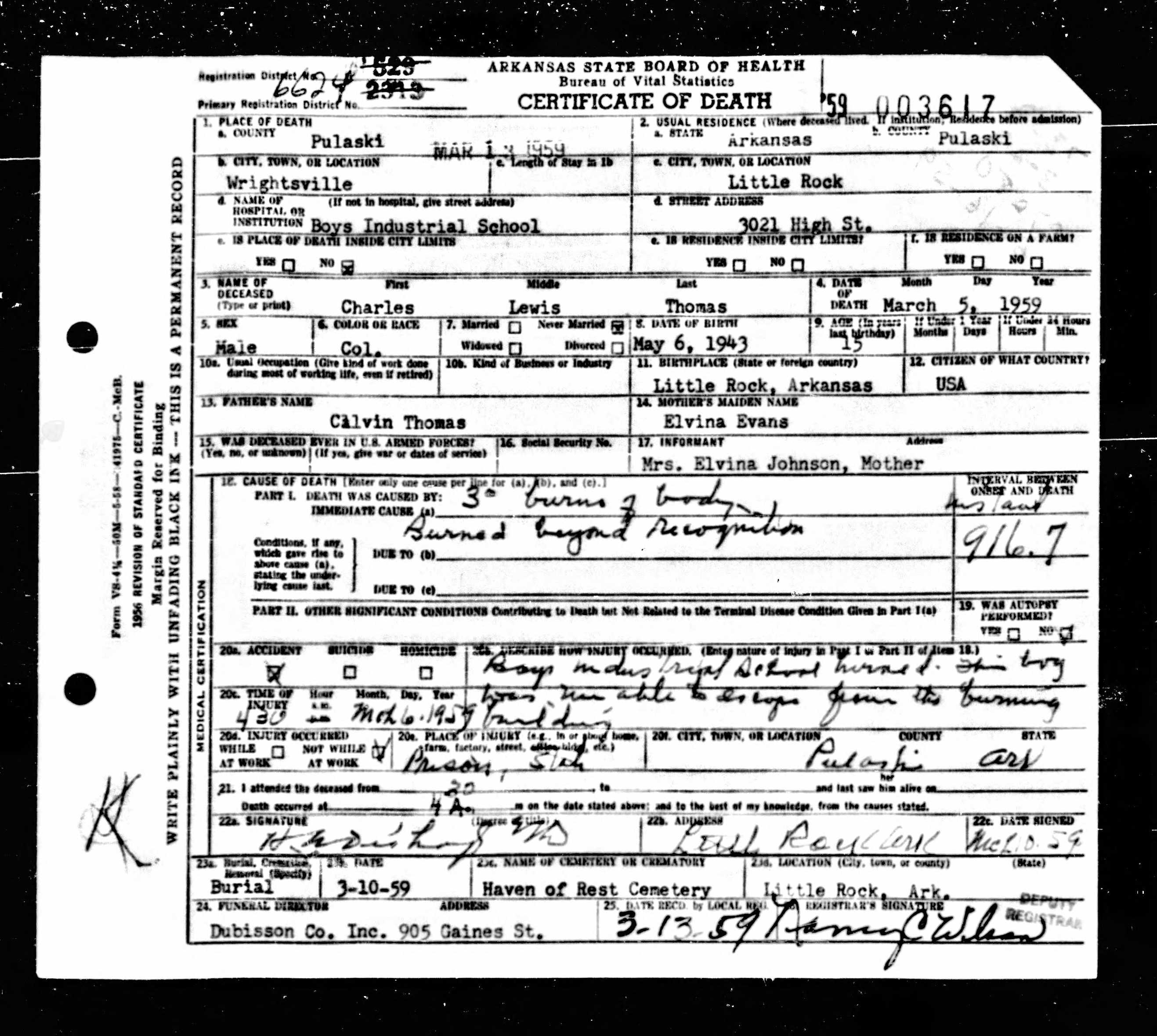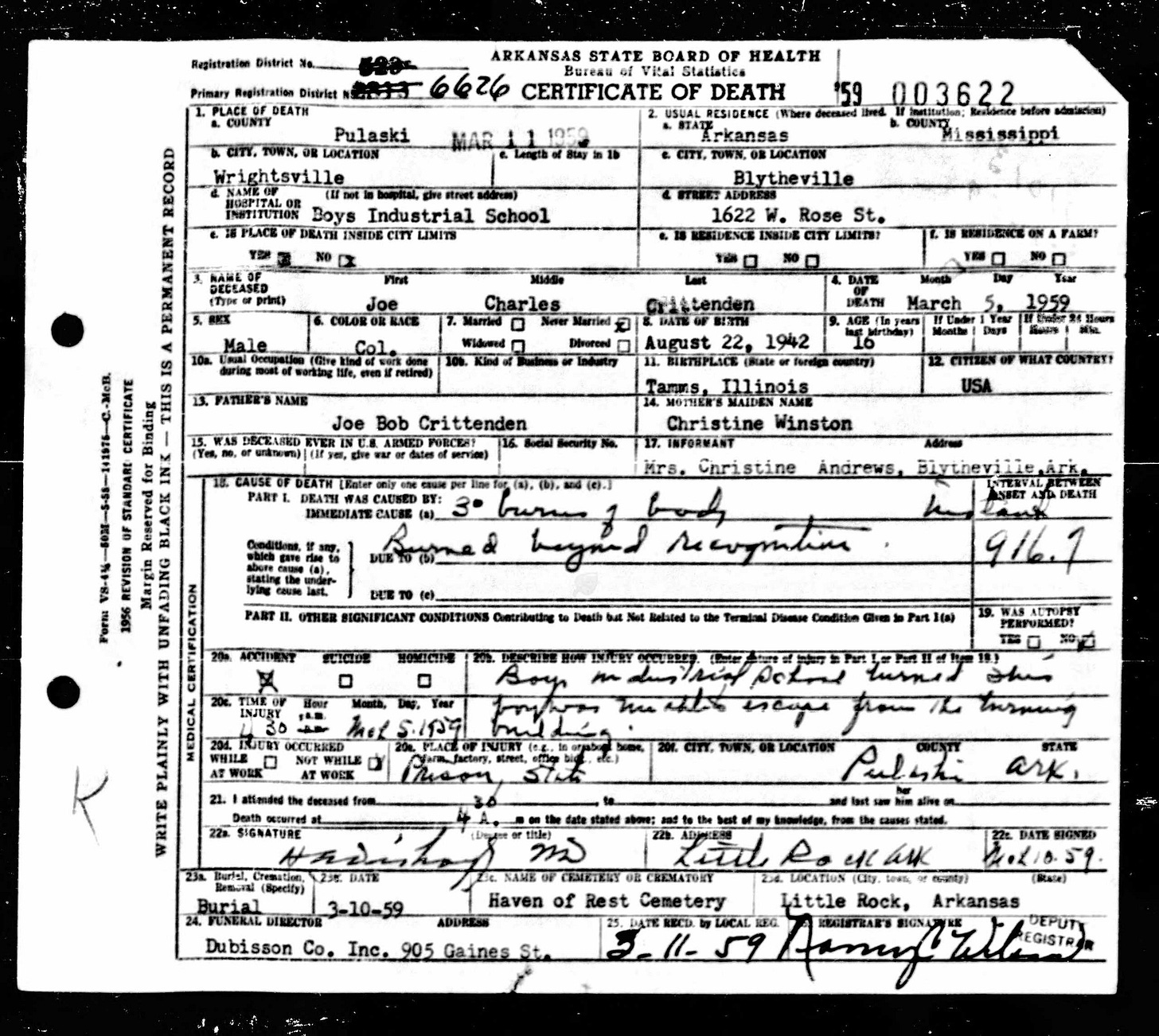 21 Dead Kids and 21 Death CertficiatesRemembering the names of the deadThe Coroner's Report PodcastNov 19, 2025ShareFrank Barnes from Lake Village, ArkansasR. D. Brown from Emerson, ArkansasJessie Carpenter from Forrest City, ArkansasJoe Crittenden from Blytheville, ArkansasLindsey Cross from North Little Rock, ArkansasJohn Daniel from El Dorado, ArkansasHenry Daniels from Little Rock, ArkansasJohn George from North Little Rock, ArkansasAmos Gyce from Woodson, ArkansasRoy Allen Hegwood from El Dorado, ArkansasWillie Horner from North Little Rock, ArkansasO. T. Meadows from El Dorado, ArkansasWillie Piggee Jr. from Dewitt, ArkansasRoy Chester Powell from Forrest City, ArkansasCecil Preston from Antoine, ArkansasCharles Lewis Thomas from Little Rock, ArkansasCarl Edward Thornton from North Little Rock, ArkansasJohnnie Tillison, Jr. from La Grange, ArkansasEdward Tolston from Wilmot, ArkansasCharles White from Malvern, ArkansasWillie Lee Williams from Helena, ArkansasPrevious