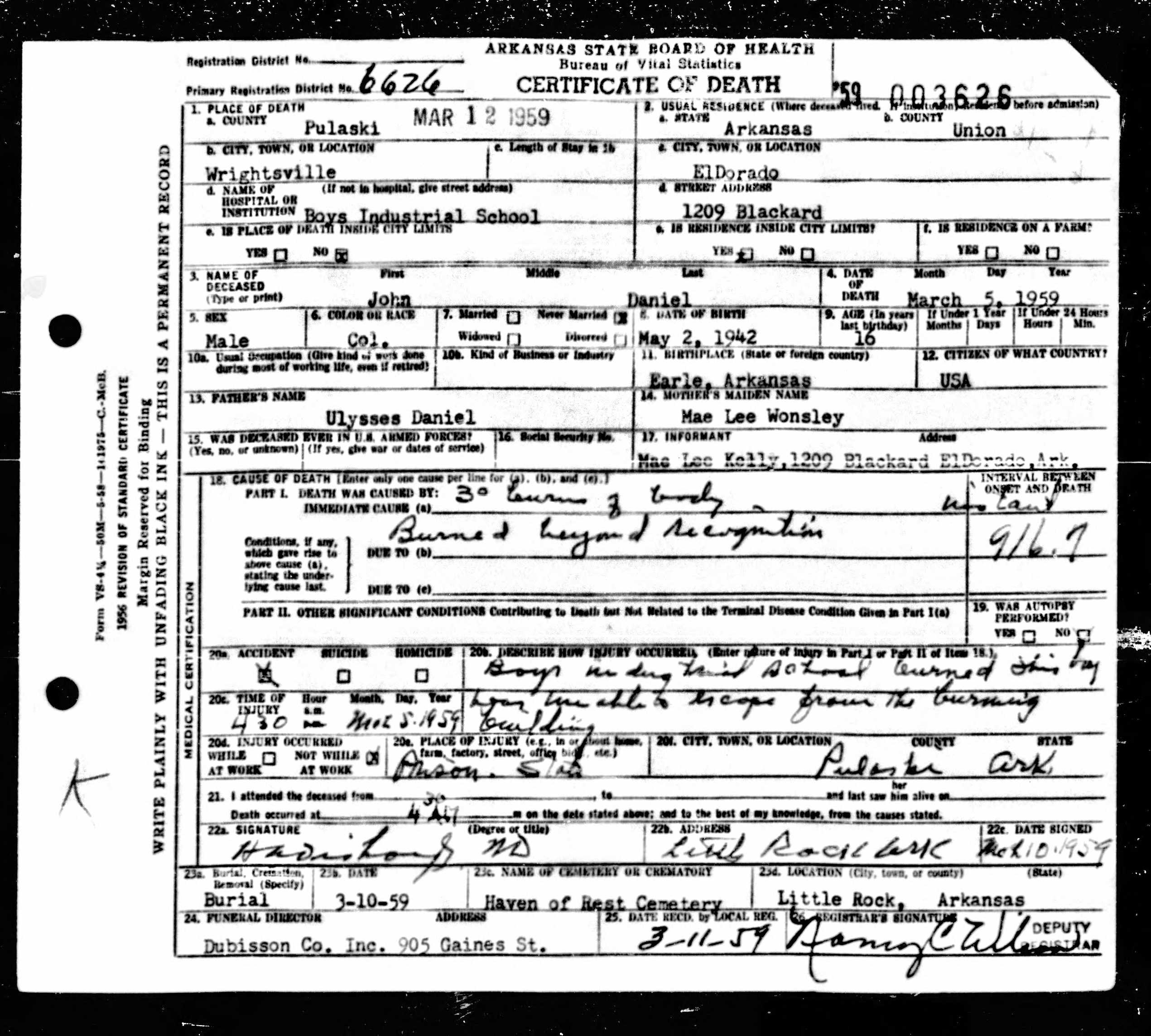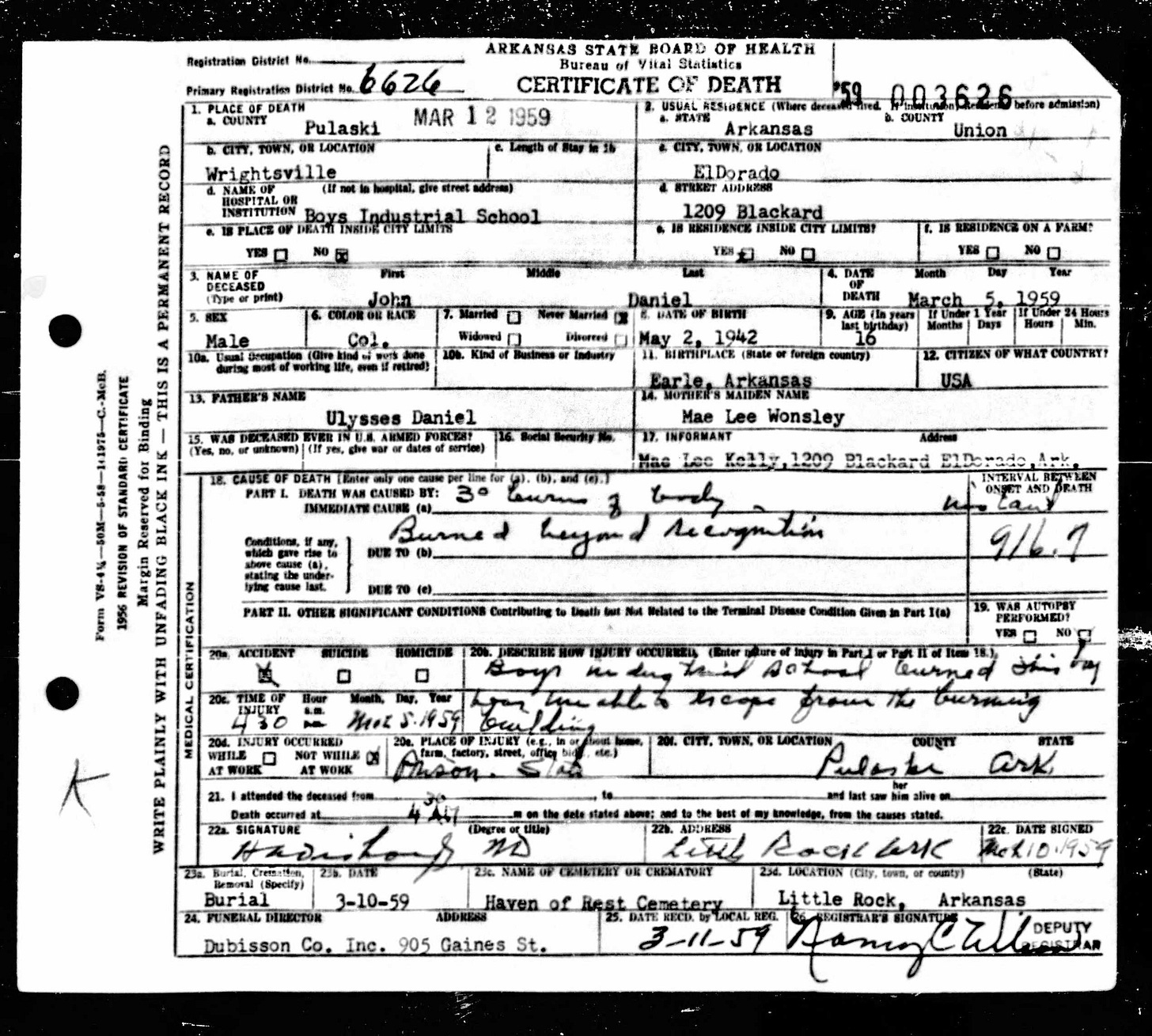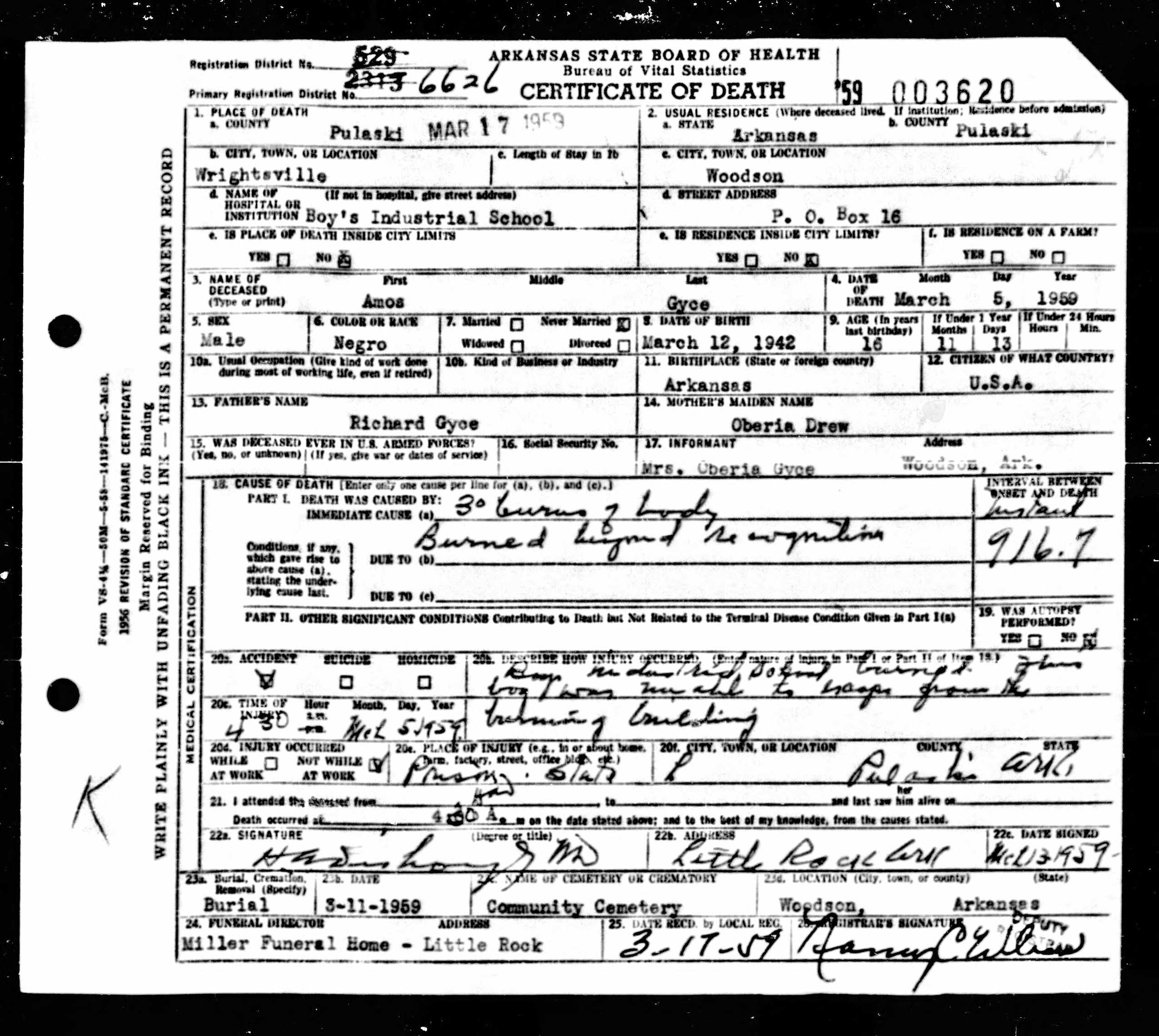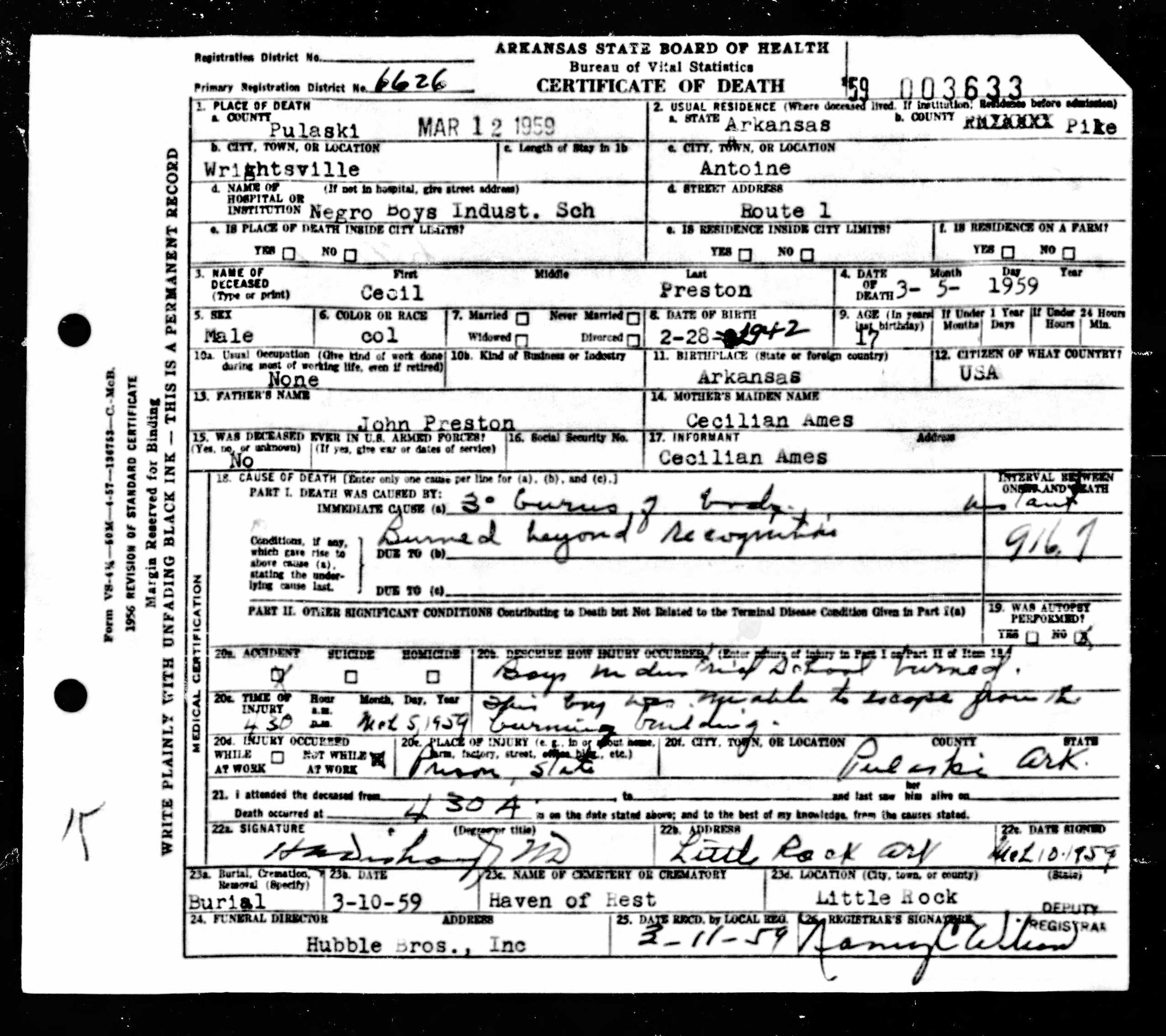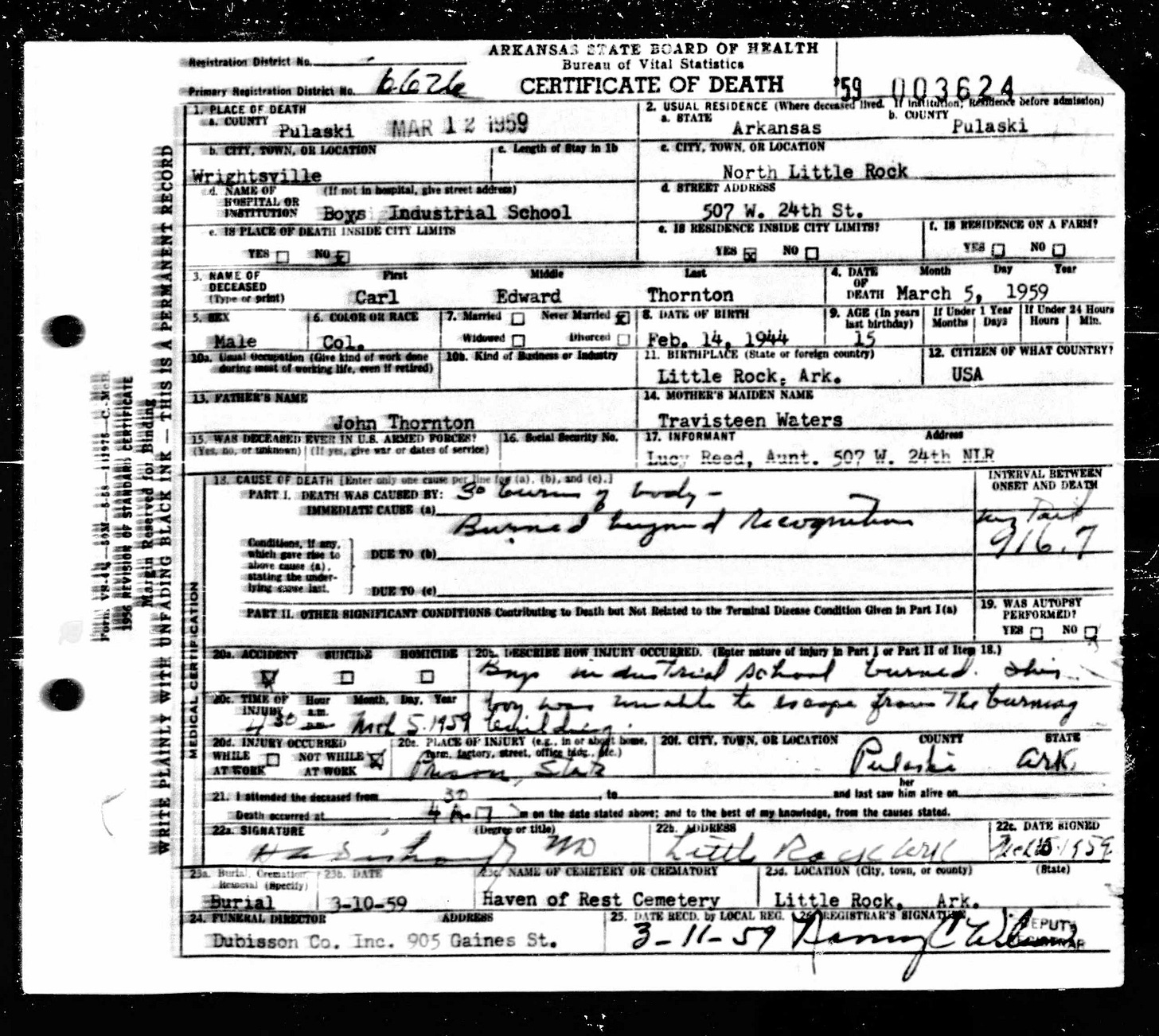 21 Dead Kids and 21 Death CertficiatesRemembering the names of the deadThe Coroner's Report PodcastNov 19, 2025ShareFrank Barnes from Lake Village, ArkansasR. D. Brown from Emerson, ArkansasJessie Carpenter from Forrest City, ArkansasJoe Crittenden from Blytheville, ArkansasLindsey Cross from North Little Rock, ArkansasJohn Daniel from El Dorado, ArkansasHenry Daniels from Little Rock, ArkansasJohn George from North Little Rock, ArkansasAmos Gyce from Woodson, ArkansasRoy Allen Hegwood from El Dorado, ArkansasWillie Horner from North Little Rock, ArkansasO. T. Meadows from El Dorado, ArkansasWillie Piggee Jr. from Dewitt, ArkansasRoy Chester Powell from Forrest City, ArkansasCecil Preston from Antoine, ArkansasCharles Lewis Thomas from Little Rock, ArkansasCarl Edward Thornton from North Little Rock, ArkansasJohnnie Tillison, Jr. from La Grange, ArkansasEdward Tolston from Wilmot, ArkansasCharles White from Malvern, ArkansasWillie Lee Williams from Helena, ArkansasPrevious