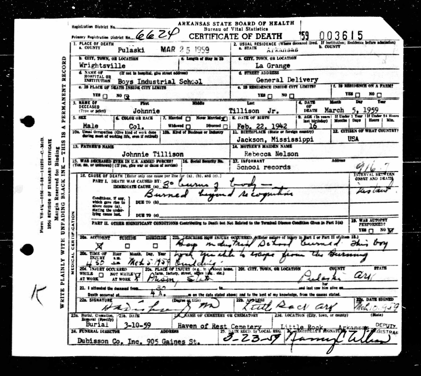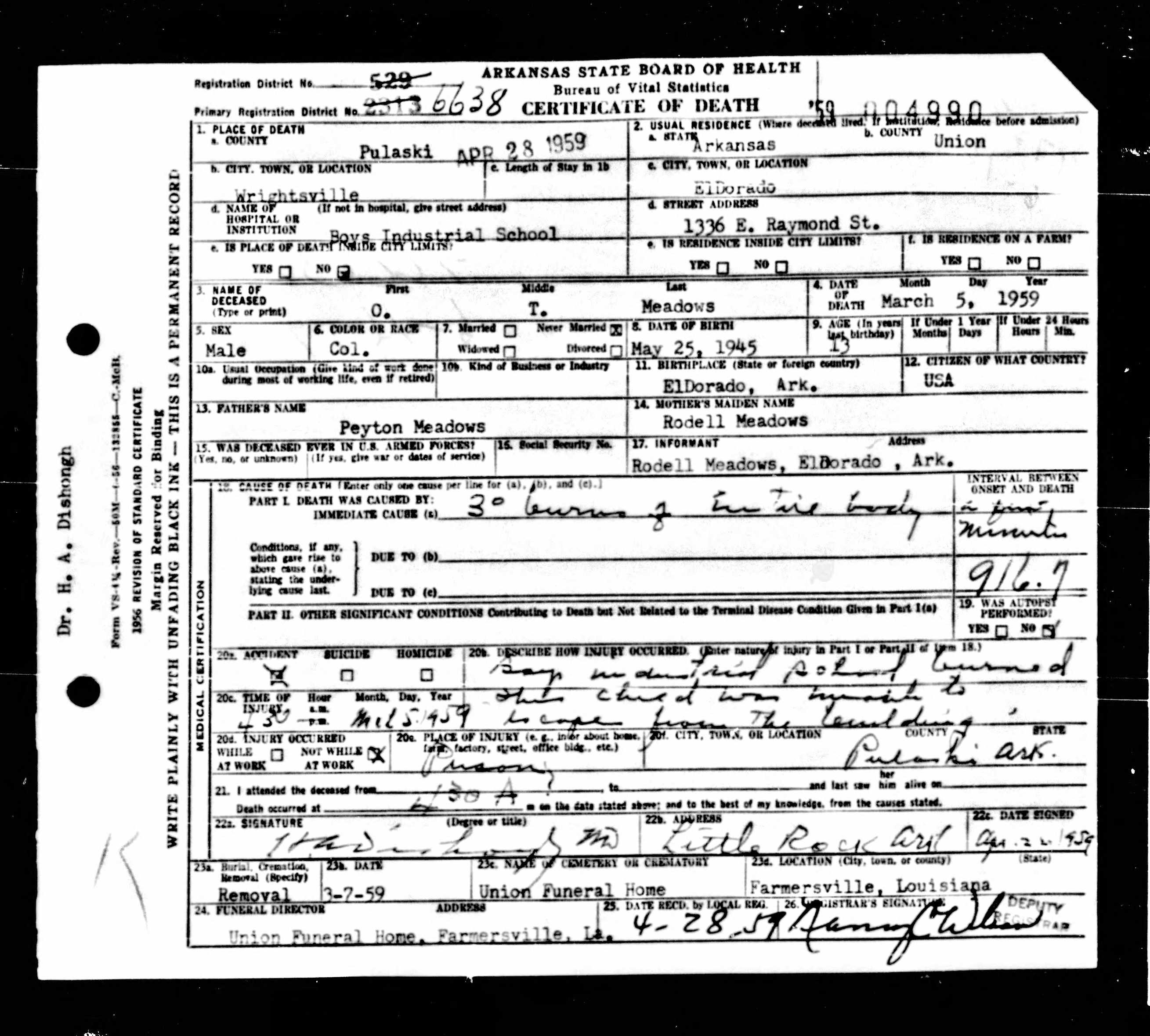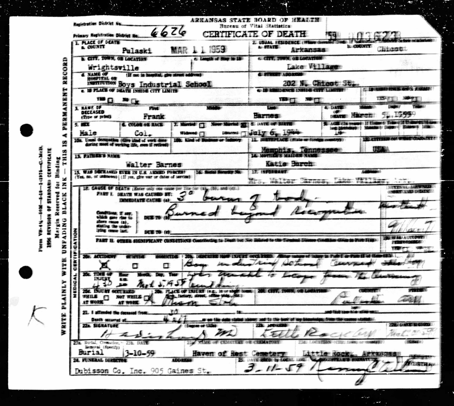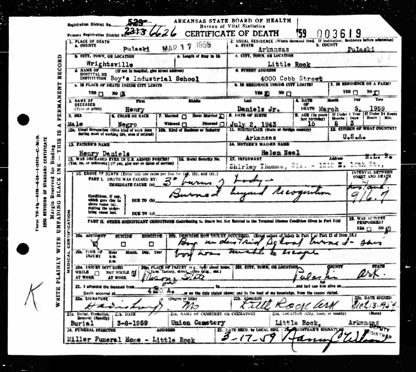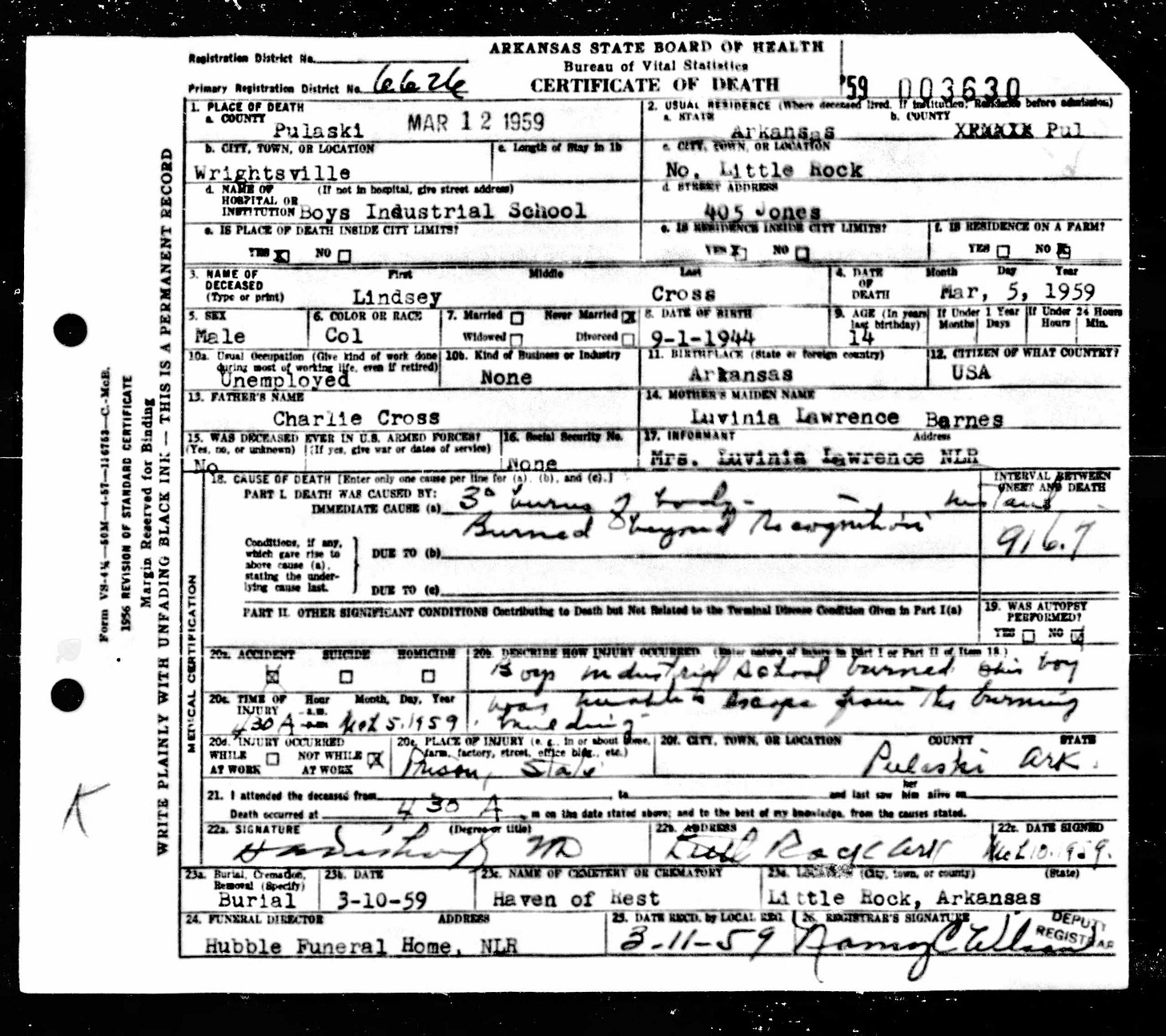 21 Dead Kids and 21 Death CertficiatesRemembering the names of the deadThe Coroner's Report PodcastNov 19, 2025ShareFrank Barnes from Lake Village, ArkansasR. D. Brown from Emerson, ArkansasJessie Carpenter from Forrest City, ArkansasJoe Crittenden from Blytheville, ArkansasLindsey Cross from North Little Rock, ArkansasJohn Daniel from El Dorado, ArkansasHenry Daniels from Little Rock, ArkansasJohn George from North Little Rock, ArkansasAmos Gyce from Woodson, ArkansasRoy Allen Hegwood from El Dorado, ArkansasWillie Horner from North Little Rock, ArkansasO. T. Meadows from El Dorado, ArkansasWillie Piggee Jr. from Dewitt, ArkansasRoy Chester Powell from Forrest City, ArkansasCecil Preston from Antoine, ArkansasCharles Lewis Thomas from Little Rock, ArkansasCarl Edward Thornton from North Little Rock, ArkansasJohnnie Tillison, Jr. from La Grange, ArkansasEdward Tolston from Wilmot, ArkansasCharles White from Malvern, ArkansasWillie Lee Williams from Helena, ArkansasPrevious